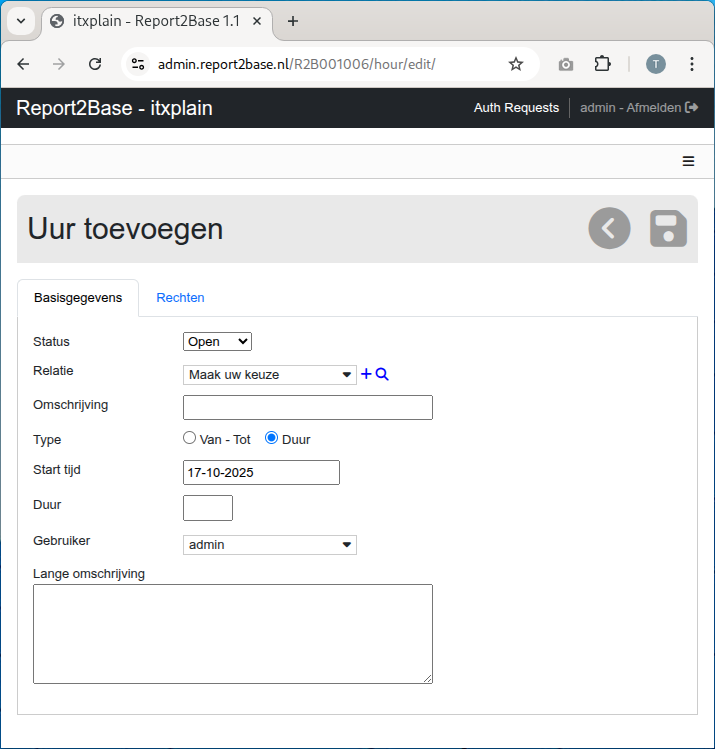 Met Duur kan er een startdatum, met optioneel een starttijd gekozen worden. Vervolgens kan er een duur opgegeven worden. Het voordeel hiervan is dat invoer makkelijker wordt. Is er b.v. van 10.00 t/m 13.00 gewerkt met een half uur pauze? Dan registreer je simpelweg 2,5-uur en kan dat met 1 invoer. Met Van-Tot zou je hiervoor 2x een tijd moeten invoeren.